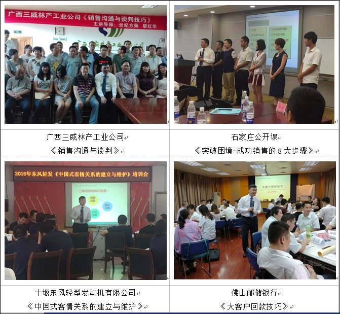 黎老師24年的營銷管理和培訓(xùn)生涯,積累了豐富的企業(yè)管理實(shí)戰(zhàn)和顧問經(jīng)驗(yàn),授課方式新穎獨(dú)特,重視與學(xué)員間的互動、交流來啟發(fā)學(xué)員,使學(xué)員在視覺、聽覺、觸覺、思維模式上形成多方位的感受,從而使之產(chǎn)生體驗(yàn);并將理論與實(shí)戰(zhàn)、認(rèn)知與實(shí)踐相結(jié)合,重視激發(fā)學(xué)員思維內(nèi)在視角,啟迪團(tuán)隊(duì)靈性及感悟智慧,其博取眾長,形象生動的授課風(fēng)格,幽默和極富感染的表達(dá)力,營造了一個個活潑有趣的培訓(xùn)課堂,充分激發(fā)了學(xué)員的潛能,使參訓(xùn)者的專業(yè)知識和技能在較短的培訓(xùn)時間內(nèi)得到了升華,深受客戶的歡迎和好評。